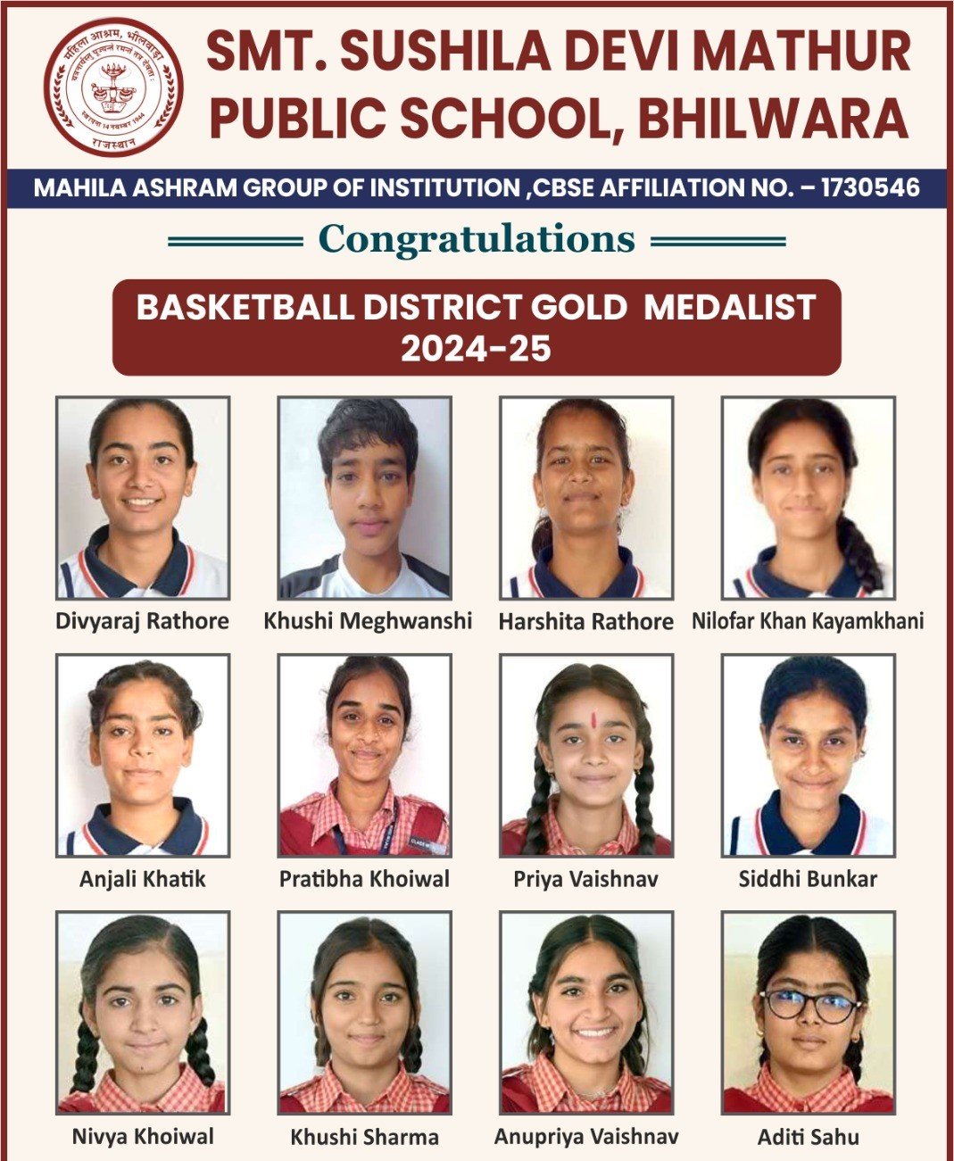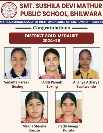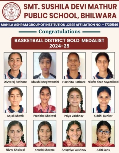 Four Students of Smt. Sushila devi mathur public school represented the school in State Level Basket Ball Tournament. One student represented in the National Level Basket Ball.